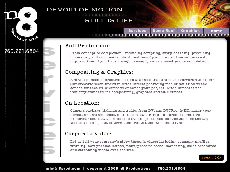 Full Video Production: From concept to completion - including scripting, story boarding, producing, voice over, and on camera talent, just bring your idea and we will make it happen. Even if you have a rough concept, we can assist you to completion.Compositing and Graphics: Are you in need of creative motion graphics that grabs the viewers attention? Our creative team works in After Effects providing rich stimulation to the senses for that WOW effect to enhance your project. After Effects is the industry standard for compositing, graphics and title effects.On Location: Camera package, lighting and audio, from DVcam, DVCPro, & HD; name your format and we will shoot in it. Interviews, B-roll, full productions, live preformances, litigation, special events (meetings, conventions, birthdays, weddings etc...), out of town, and live to tape, we handle it all.Corporate Video: Let us tell your company's story through video; including company profiles, training, new product launch, news/press releases, marketing, sales brochures and streaming media over the web.
