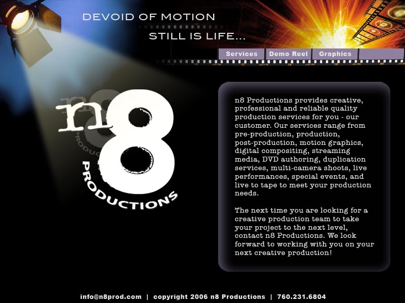 n8 Productions provides creative, professional and reliable quality production services for you - our customer. Our services range from pre-production, production, post-production, motion graphics, digital compositing, streaming media, DVD authoring, duplication services, multi-camera shoots, live performances, special events, live to tape, run and gun ENG, 1080i, 720p, DVCPRO, DVCAM, 16mm, 35mm and full production EFP to meet your production needs. The next time you are looking for a creative production team to take your project to the next level, contact n8 Productions. We look forward to working with you on your next creative production in San Diego, Orange County and Los Angeles.